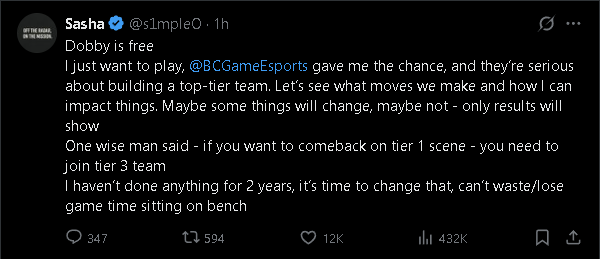 Ο s1mple όπως αναφέρει στο tweet του, βαρέθηκε να είναι 2 χρόνια στον πάγκο και να χάνει χρόνο και για αυτό εκμεταλλεύτηκε την ευκαιρία που του έδωσαν οι BC οι οποίοι έχουν βλέψεις να γίνουν μια Tier 1 ομάδα. Όπως λέει και ο Ουκρανός άμα θες να γυρίσεις πίσω στο Tier 1 πρέπει να υπογράψεις σε μια Tier 3 ομάδα.